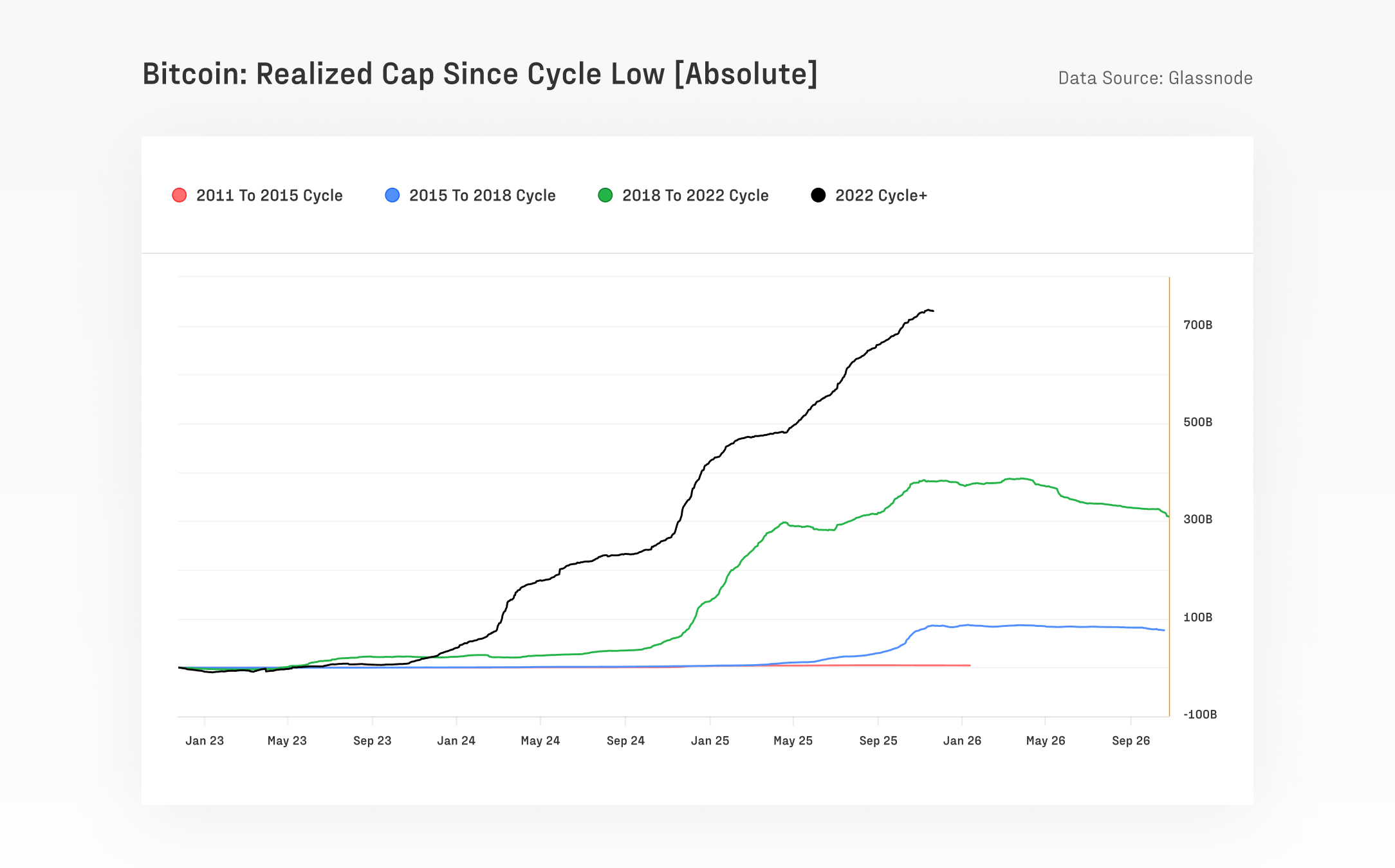 Bitcoin attracted $732B in new capital this cycle — more than all prior cycles combined. Ethereum and the broader altcoin sector appreciated strongly too, peaking at over +350% gains, but did not outperform Bitcoin (+690%) as in prior cycles.