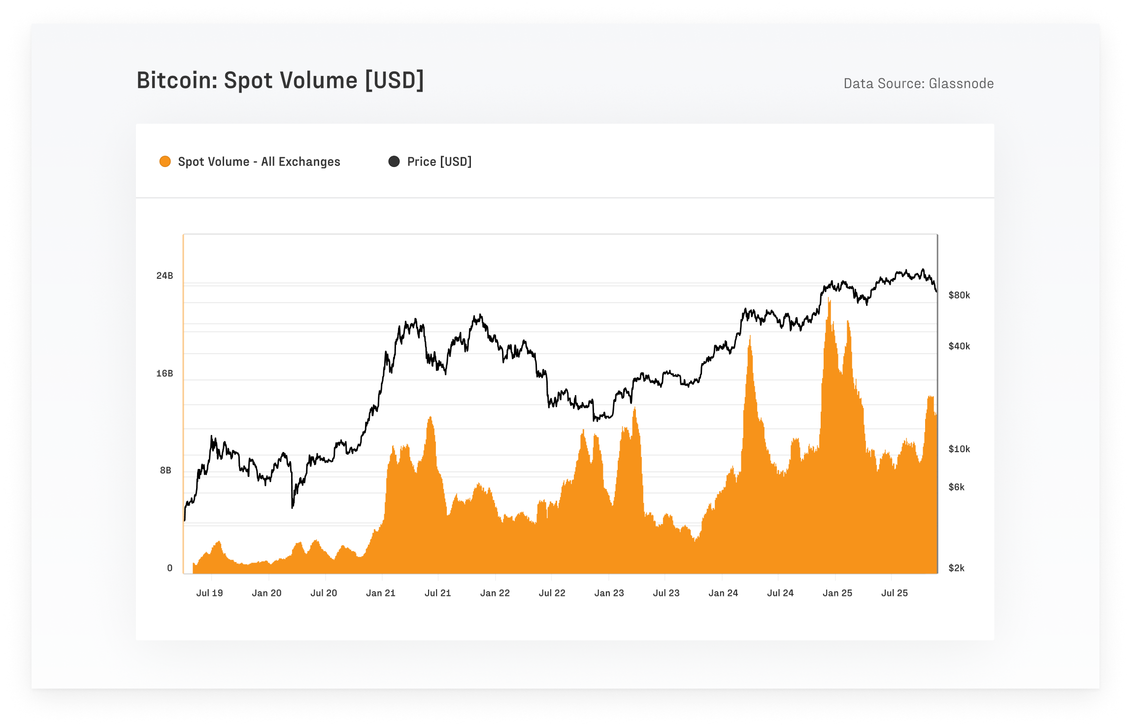Bitcoin spot volumes have scaled into the $8B–$22B range, reflecting deeper liquidity, just as one-year realized volatility has declined from 84.4% to 43.0%. However, average daily liquidations expanded to $68M long and $45M short.